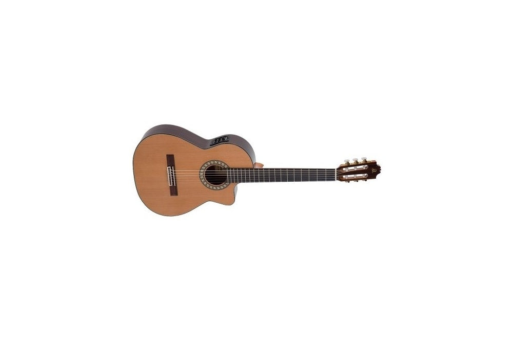 Stunning Rosewood and Solid Cedar guarantee a timbre able to match the beautiful appearance. This Electro Cutaway version features Fishman Clasica Blend Preamp. 4/4 Size • Hi-Gloss Solid Cedar Top • Hi-Gloss Rosewood Back & Sides • African Mahogany Neck with Ebony Reinforcement • Ebony Fingerboard • Rosewood Bridge • Lyre Gold M/Heads • Fishman Clasica Blend Preamp.