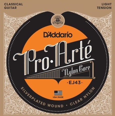 EJ43 is the lightest tension available of D'Addario's best selling Pro-Arte series. Great for beginners or experienced players with a lighter touch, they provide ease of play without sacrificing rich tone. EJ43's contain silver wound on nylon bass strings with clear nylon trebles.