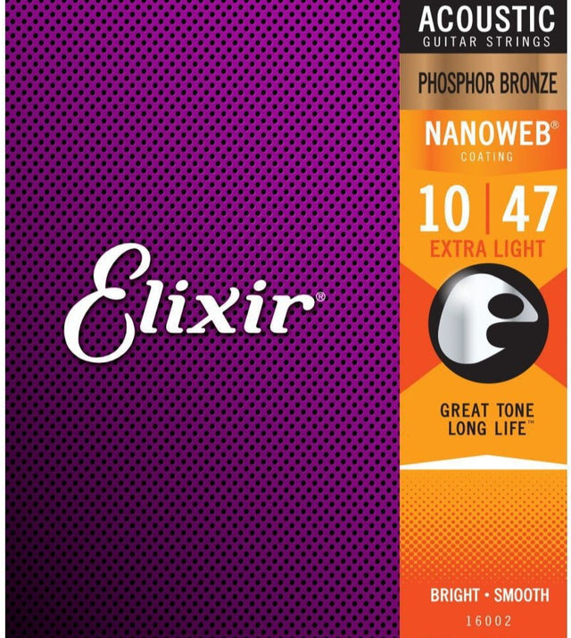 Elixir Strings Acoustic Phosphor Bronze with NANOWEB Coating deliver distinctive phosphor bronze warmth and sparkle together with extended tone life that players have come to expect from Elixir Strings. The #1 selling US acoustic guitar string, Elixir Strings, provide consistent performance, smooth feel and reduce finger squeak. With less hassle and expense of frequent string changes, you enjoy more time making music.
