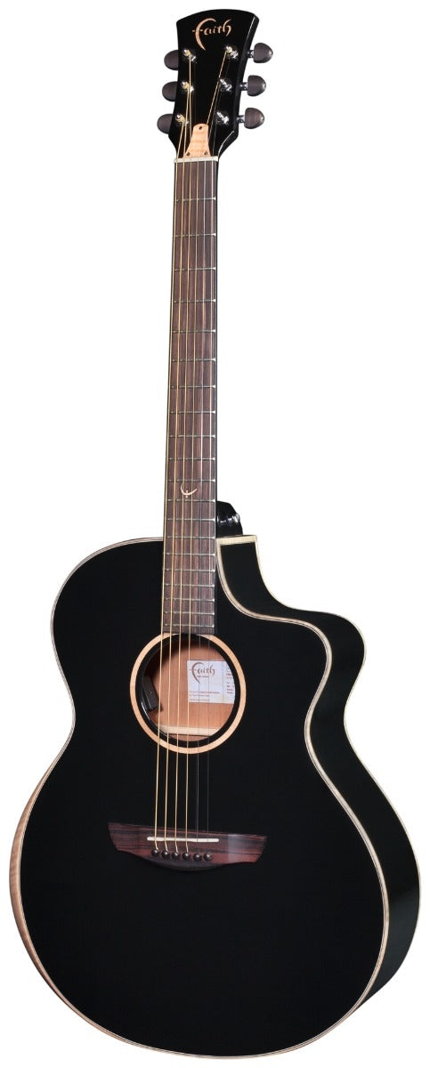 Faith Eclipse models are designed as the ultimate ‘stage guitars,’ with workhorse reliability yet maximum performance capability. And they always look awesome in the spotlight. The classic combination of a Solid Spruce Top and Solid Mahogany back and sides ensure you have a superb unplugged sound, with an ideal blend of presence and full-bodied tone. The onyx black finish, covered with carefully applied, clear lacquer, helps to tame the tonewood’s natural resonance, producing a reassuringly balanced and focused tone when amplified, yet retaining that essential warmth in the midrange.