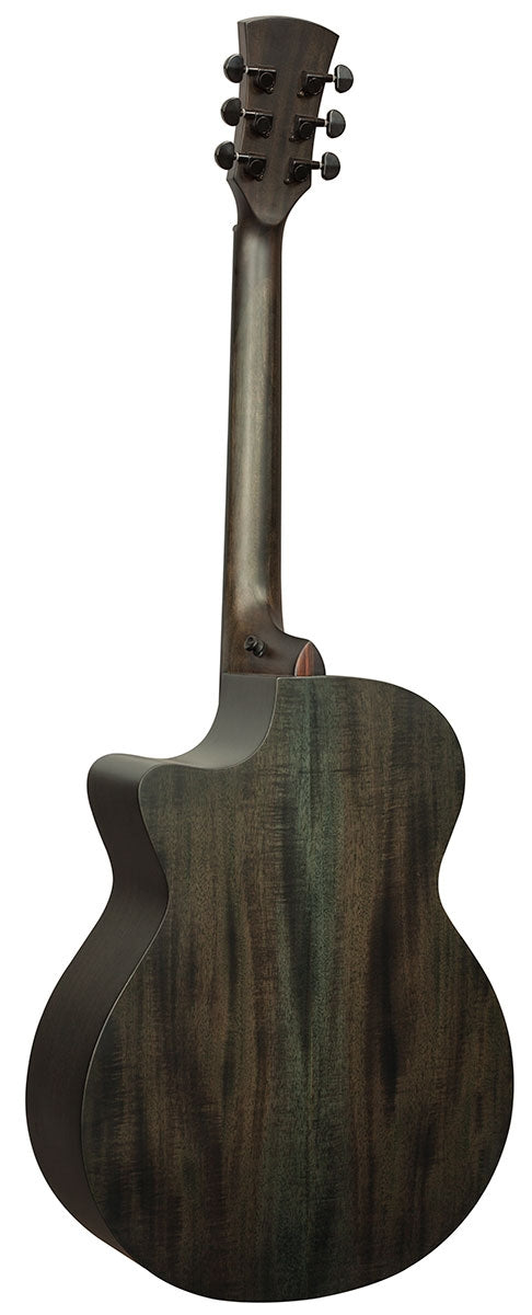 Using a hand-rubbed stain - rather than a sprayed paint finish - results in a unique look to each guitar. Further to this, Spruce and Mahogany have differing cellular structures, so there is natural variation in the way that the stain takes to each piece of tonewood. This stunning quirk of nature is especially noticeable on the Spruce top, as in some areas, the black stain will be absorbed more than others, creating an individual patina to each and every model: Some will be more uniform black, some will have more wood pattern visible.