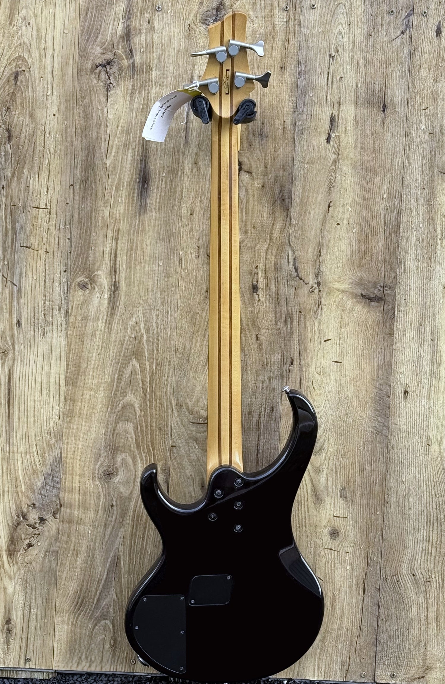 - Body: Basswood core with a quilted maple top, lightweight yet resonant, with a striking visual grain under the trans black gloss.