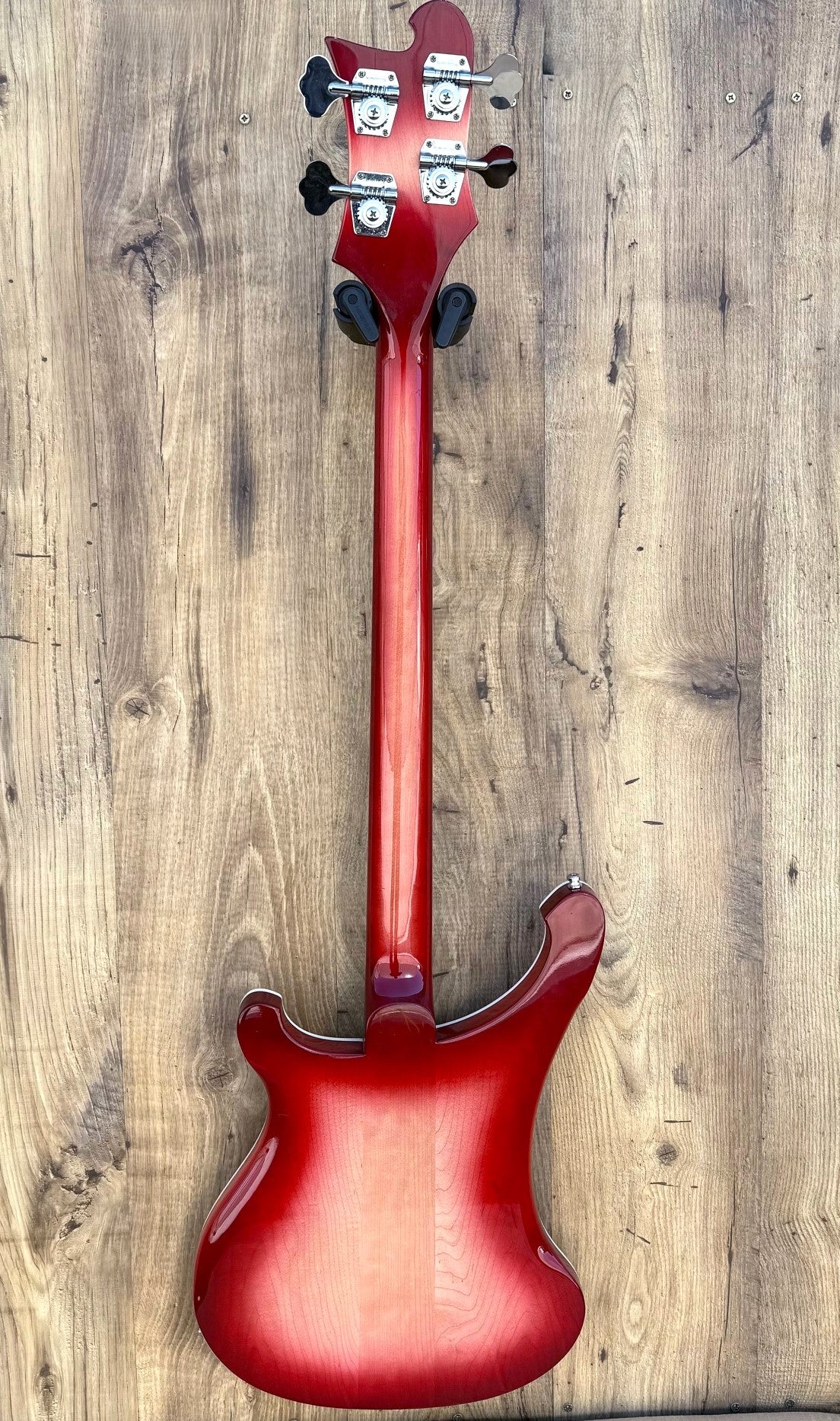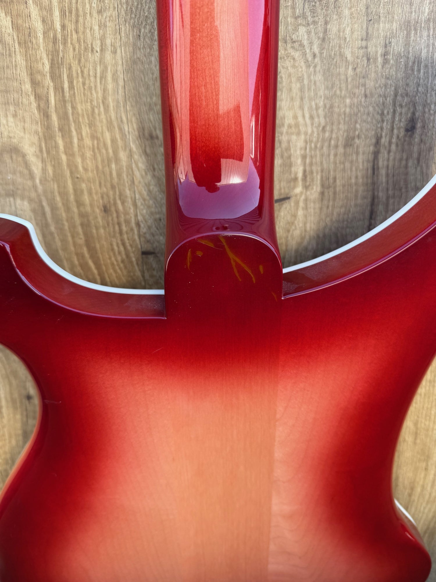 In 2003, Rickenbacker introduced the "Montezuma Brown" finish as its Color of the Year, adding a touch of exclusivity to that year's models. This finish showcases the wood grain beneath, offering a visually appealing and vintage-inspired look. The bass features a solid maple body with elegant binding, a rosewood fingerboard adorned with deluxe triangular inlays, and the iconic double-cutaway shape that Rickenbacker is known for. The neck-through-body construction not only enhances sustain but also contributes to the instrument's sleek appearance.