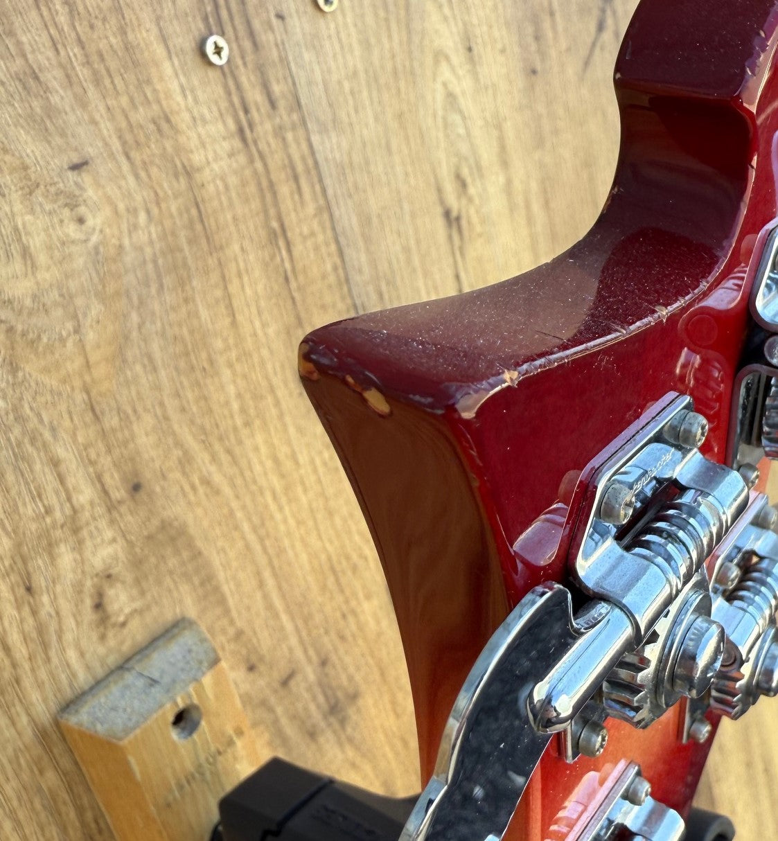 a couple of scratches on the heel of the neck and  a little nick on the top of the headstock, otherwise great. Has upgraded bridge