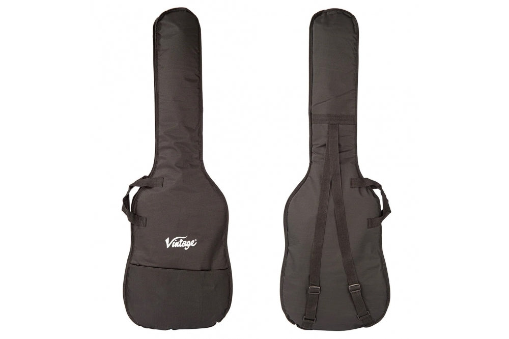 This superior bass guitar pack includes a Vintage branded padded carry bag, guitar strap, guitar cable, clip-on tuner and pick.