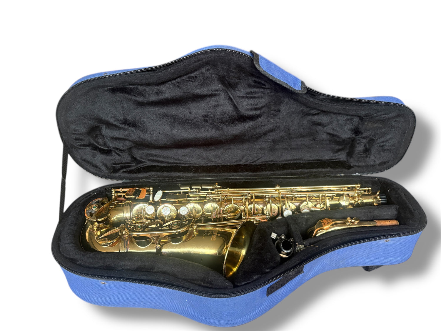 Second hand alto saxophone outfit. Pads are in good condition. Has been well played and there is lacquer wear. This is a really nice sax to play. The keys are comfortable under the fingers. It feels solid and responsive. A great beginner saxophone.