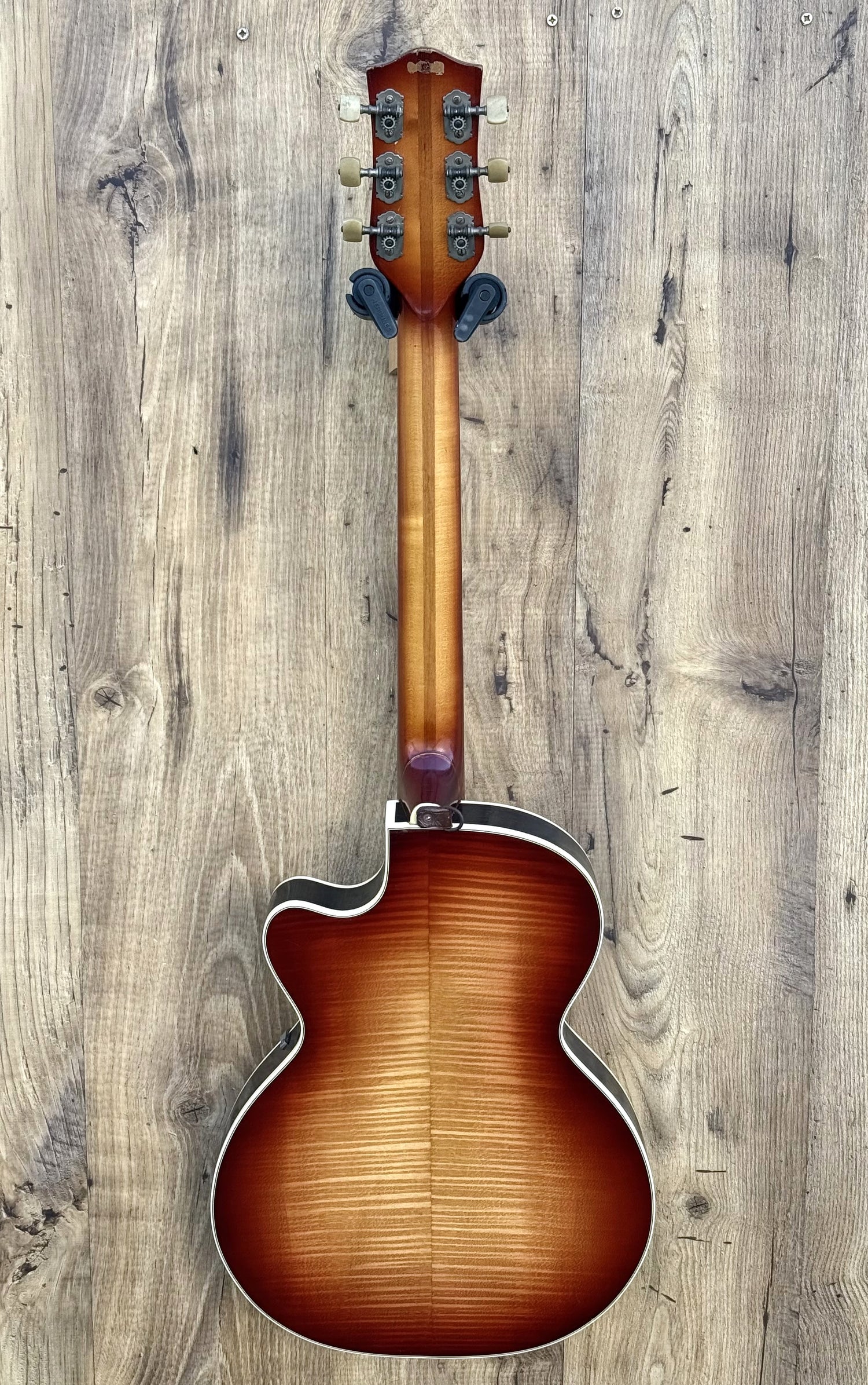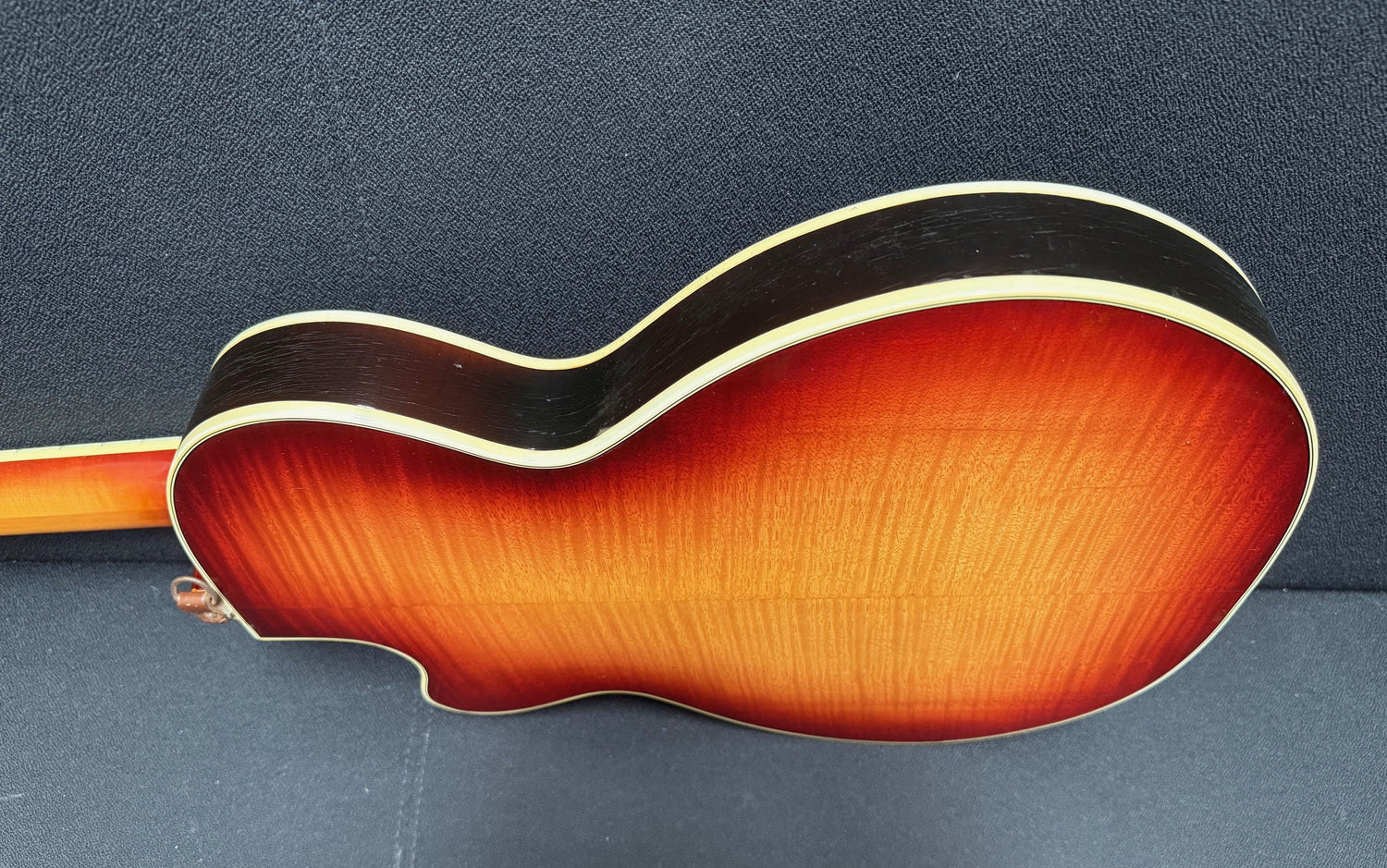 Body Type: Semi-hollow electric (hollow body without sound holes), featuring a lightly arched spruce top and flat, book-matched flamed maple back and sides.