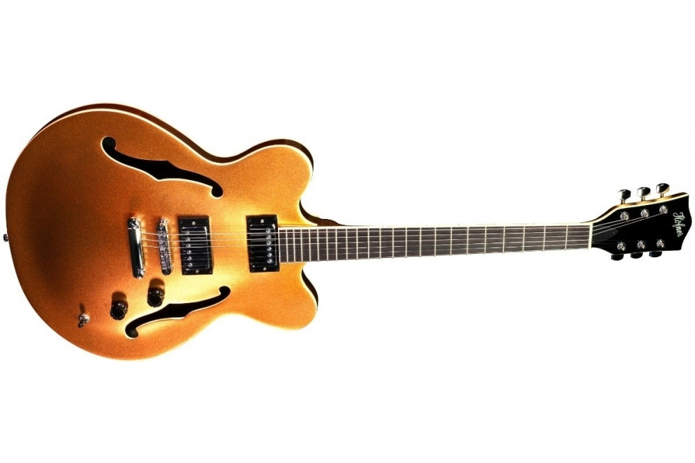 Gloss Pearl Gold Finish • Mahogany Top • Mahogany Back & Sides • Mahogany Neck • Spruce Centerblock • Three Way Switch • Hofner Traditional Set Neck • 24.7”/628mm Scale • 44mm Nut • 22 Frets • 2x Hofner Humbucker Pickups • Three Way Switch • Volume Control • Tone Control.