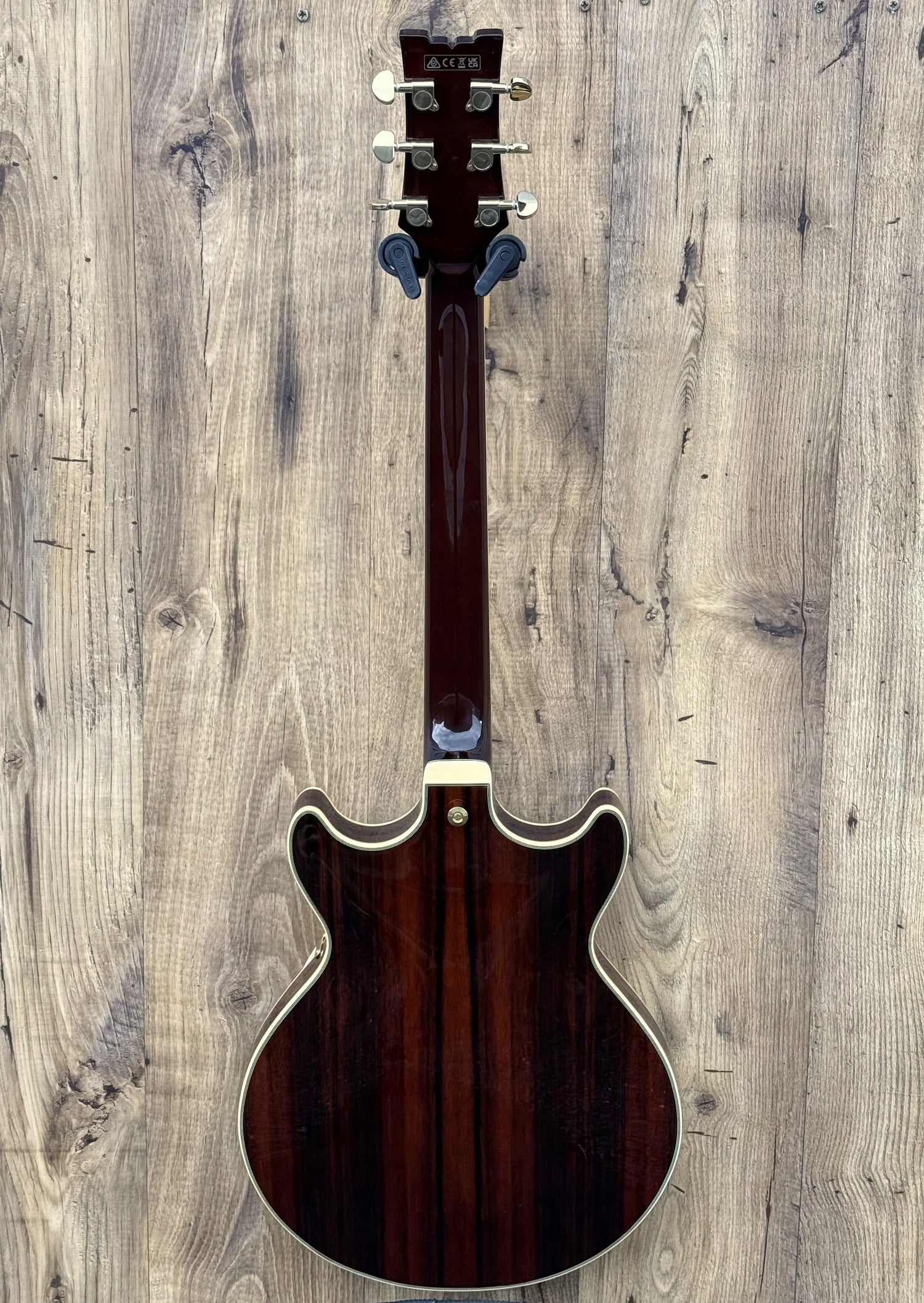 The AM93ME-NT features a beautiful macassar ebony body, giving it a striking, exotic look while enhancing tonal depth. Its double-cutaway semi-hollow construction provides the resonance and warmth expected of a jazz guitar, but with improved feedback resistance compared to larger hollow-body models. The craftsmanship is excellent, with clean binding, ornate abalone block inlays, and gold hardware adding a premium touch.