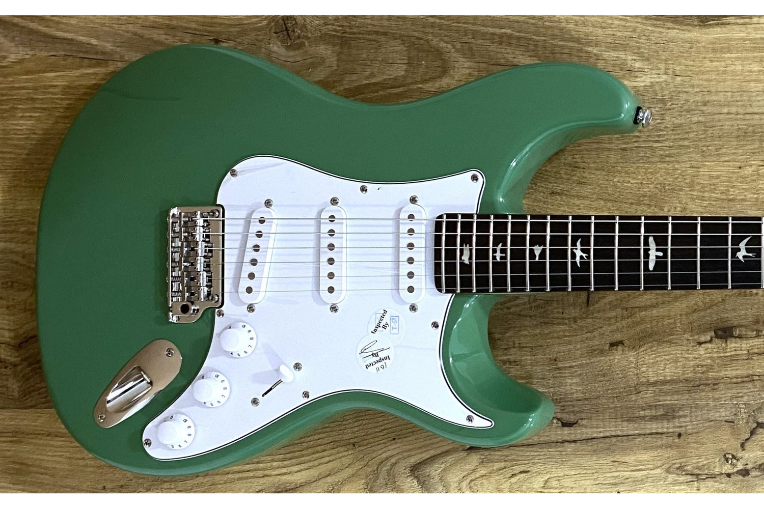 The PRS SE Silver Sky starts with a poplar body, bolt-on maple neck, and rosewood fretboard with PRS trademark bird inlays. The 22-fret, 25.5” scale length neck features the original 635JM carve and an 8.5” fretboard radius, so the PRS SE Silver Sky will feel right at home. Plug it in, and the three single-coil 635JM “S” pickups will bark and sing. This guitar is anchored by a two-point steel tremolo, synthetic bone nut, and vintage-style tuners. Other design features include the PRS Silver Sky inverted headstock shape and the PRS double-acting truss rod (accessible from the front of the headstock for ease of use). Ships with PRS Classic 10-46 strings and gig bag.