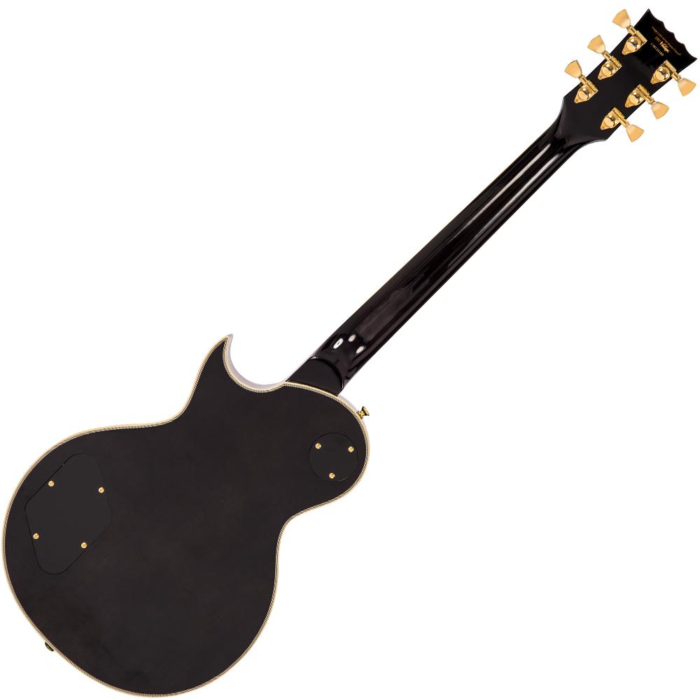 The Vintage V100MP is equipped with top quality hardware and sings with almost limitless sustain, ideal for cranking out your own fuzz-fuelled runaway riffs. With a visual capped by two pairs of mismatched tone and volume knobs, natural maple top and gloss black back, and Grover 102 tuners with keystone buttons, the Vintage V100MN is the epitome of glam star style.