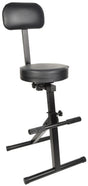 A foldable high chair for guitarists, keyboardists and other musicians with padded seat and backrest for added comfort. The height and backrest positions are adjustable and a bar along the front leg forms 2 pegs for resting feet on. Perfect for live performance or studio work.