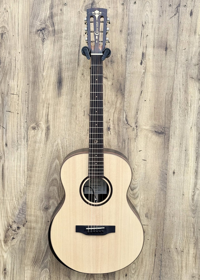 • The combination of a solid Engelmann spruce top and dense Macassar ebony back/sides gives the guitar a pleasing balance of brightness and warmth. According to Crafter, Macassar’s density helps give the instrument good volume and a tight resonance.