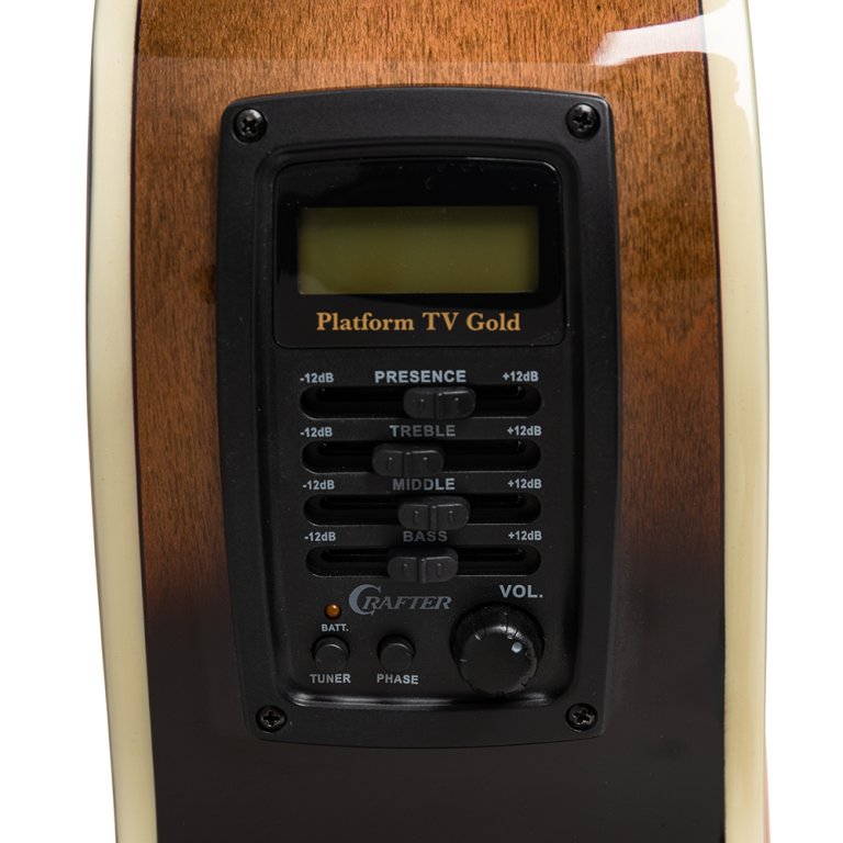 The integrated Crafter Pick-Up system with TV-preamp offers three-band EQ control, built-in tuner, and phase adjustment for versatile amplified performance. Chrome Crafter machine heads maintain tuning stability, while Elixir strings (.012-.053) provide durability and tonal clarity. Finished in vintage sunburst with a high-gloss lacquer.