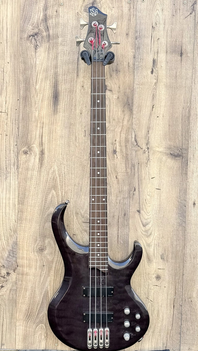 The BTB400QM is part of Ibanez’s Boutique Bass Workshop (BTB) series, introduced in the early 2000s and built in South Korea. It’s a bold, modern bass that blends premium features with ergonomic design, and the Transparent Black finish over quilted maple gives it serious visual punch.