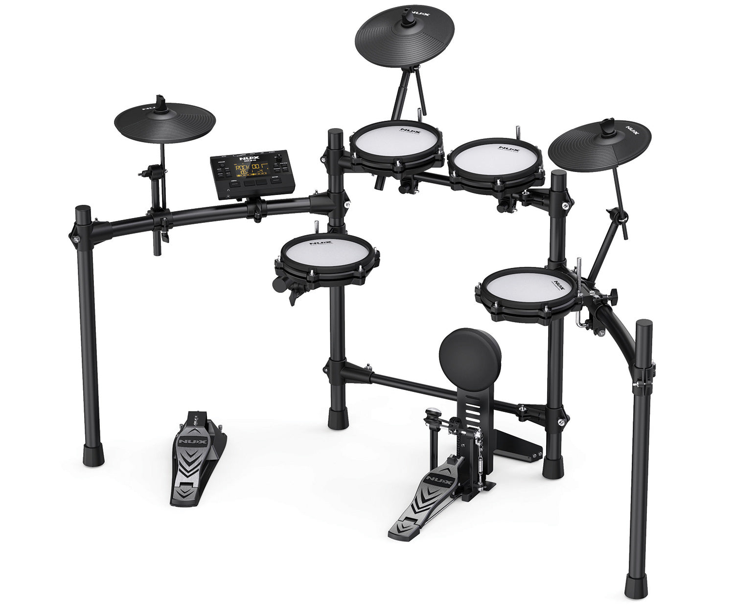 Complete digital drum outfit with mesh drum pads mounted to an adjustable rack stand. 3 tom pads and 1 snare pad each have dual triggers for side-stick and rim-shot effects. Hi-hat, crash and ride pads each have edge and bow-shot zones and can respond to hand chokes for realistic muting. A pressure-sensitive remote pedal performs gradual closing of the hi-hats. A separate kick pad and pedal assembly provide a natural feeling bass drum trigger. All triggers are wired back to the main sound module, which has a large accessible control surface and backlit display. A total of 15 drum sound sets are included with an adjustable reverb effect. Audio 6.3mm jack output to a mixing console or drum amplifier can be either mono or stereo and a separate stereo 3.5mm jack is provided for headphone monitoring. A built-in drum coach function is useful for improving technique from novice to professional standard. The internal adjustable click track or 10 internal demo songs are provided for general jamming. Alternatively, backing tracks may be played via the Aux line input or wireless Bluetooth® connection to play along with your own music. An inbuilt record function is also added to check back on your own playing. The convenience of a minimalist, lightweight kit with the flexibility of multiple sound sets, and still keeping a natural playing experience for real feel and expression.
