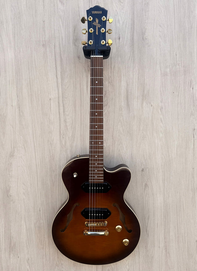 The Yamaha AEX502 is a compact, semi‑hollow P‑90 guitar with a warm, resonant voice, great playability, and a vintage‑leaning aesthetic — but its stock pickups are widely considered the weak point.