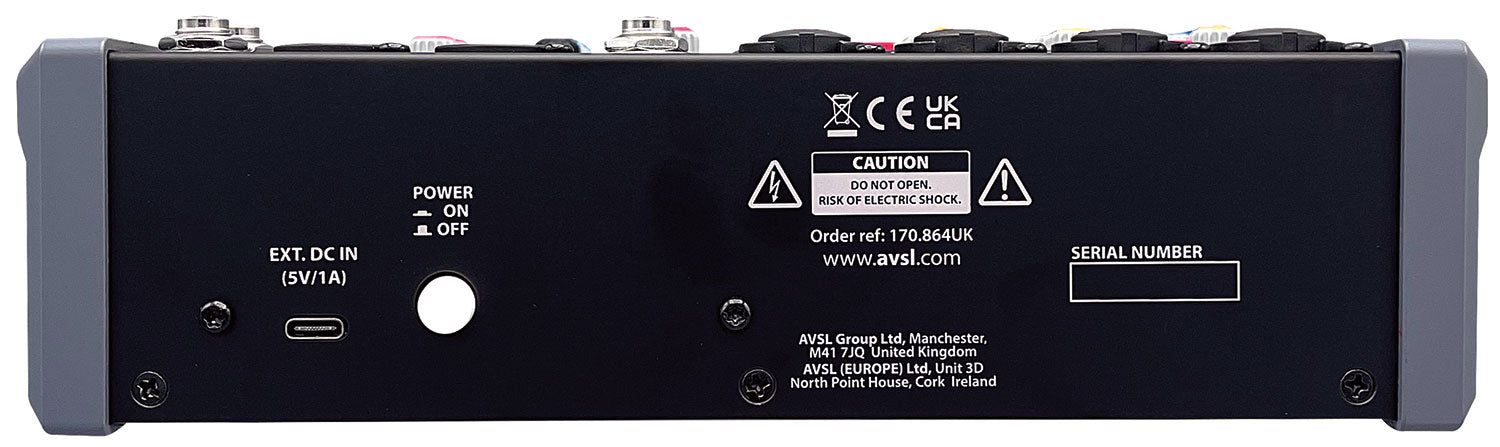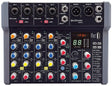 Compact format audio mixer with 2, 4 or 6 mono input channels, a stereo line input and a further minijack stereo input. Each mono mic/line channel has a combo XLR/jack input with +48V phantom power switchable in pairs for the XLR inputs. Each mic/line channel has a Gain control for matching the input source and a low-cut switch to filter out rumble or handling noise from microphones. Each mono channel also has High/Low EQ controls and an FX level control. Pairs of mono channels can be linked to act as a stereo left + right pair as required. The onboard foot-switchable DSP effects engine has 99 presets for delay, reverb and modulation effects, each of which can be adjusted using two parameter controls. An onboard Bluetooth receiver has an illuminated pairing button and independent volume control. The USB type-A port on the top panel is for playback of audio files or can be used to record the main outputs to a USB storage deviceor as an external audio device when connected to a laptop. Output is delivered to a pair of balanced XLR connectors to provide low noise operation for high quality studio or live performances.