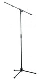 One-piece boom arm. Zinc die-cast base with folding legs.