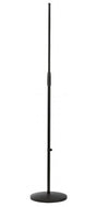 Sound-absorbing cast-iron base and straight microphone stand with black powder-coated screw-in rod, 3/8" thread. Height adjustable stand. 2-piece telescopic design.