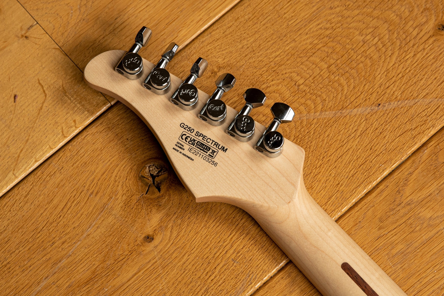 G250 Spectrum is designed for guitarists that seek a simple, slick-looking guitar with retro styling and colors that pop, while applying essential advanced components to make the guitar both greatly playable and enjoyable. Colorful sparkling metallic finishes with matching headstock bring back nostalgia of the modern-retro era when the music scene was at its flashy glamor peak. Newer generation of players will also appreciate its simplistic design and bright colored layout.