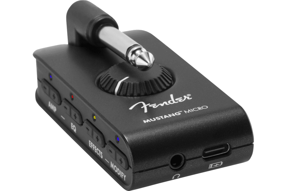Mustang Micro is a complete personal guitar amplifier featuring a wide selection of tones from the wildly popular Mustang series amps. Plug Mustang Micro directly into your guitar, connect your favorite wired headphones, and choose your perfect amp and effect settings. It’s ideal for any player from beginner to pro, making it quick and easy to get great tones when jamming at home or on the go. Mustang Micro’s 1/8” stereo headphone out allows the flexibility to use your favorite wired headphones or earbuds and silently play with a responsive touch and feel without annoying latency. Want to jam along with tunes from your music library or favorite streaming service? Mustang Micro supports Bluetooth audio streaming from your mobile device, tablet or computer to Mustang Micro and features automatic Audio/Visual sync, making it a great tool for practicing and learning songs. And you can even record your favorite guitar tones and the Bluetooth audio stream simultaneously using Mustang Micro’s USB-C output.