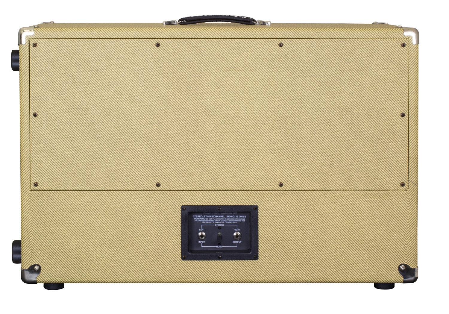 60 watt RMS Heavy-duty tweed covering Metal corners Stereo / Mono input cup 16ohms (Mono)/8 ohms per side (Stereo) Rubber feet Top handle 18mm plywood construction Convertible open back/closed back Feet on short side as well Logo mounting plate on short side so user can move it One Celestion Vintage 30 12” speaker and one G12T-75. Weight: 51.4 lbs (23.31 kg) Dimensions: (LxWxH) 30.5” x 14” x 21”/ 775mm x 355mm x 533mm