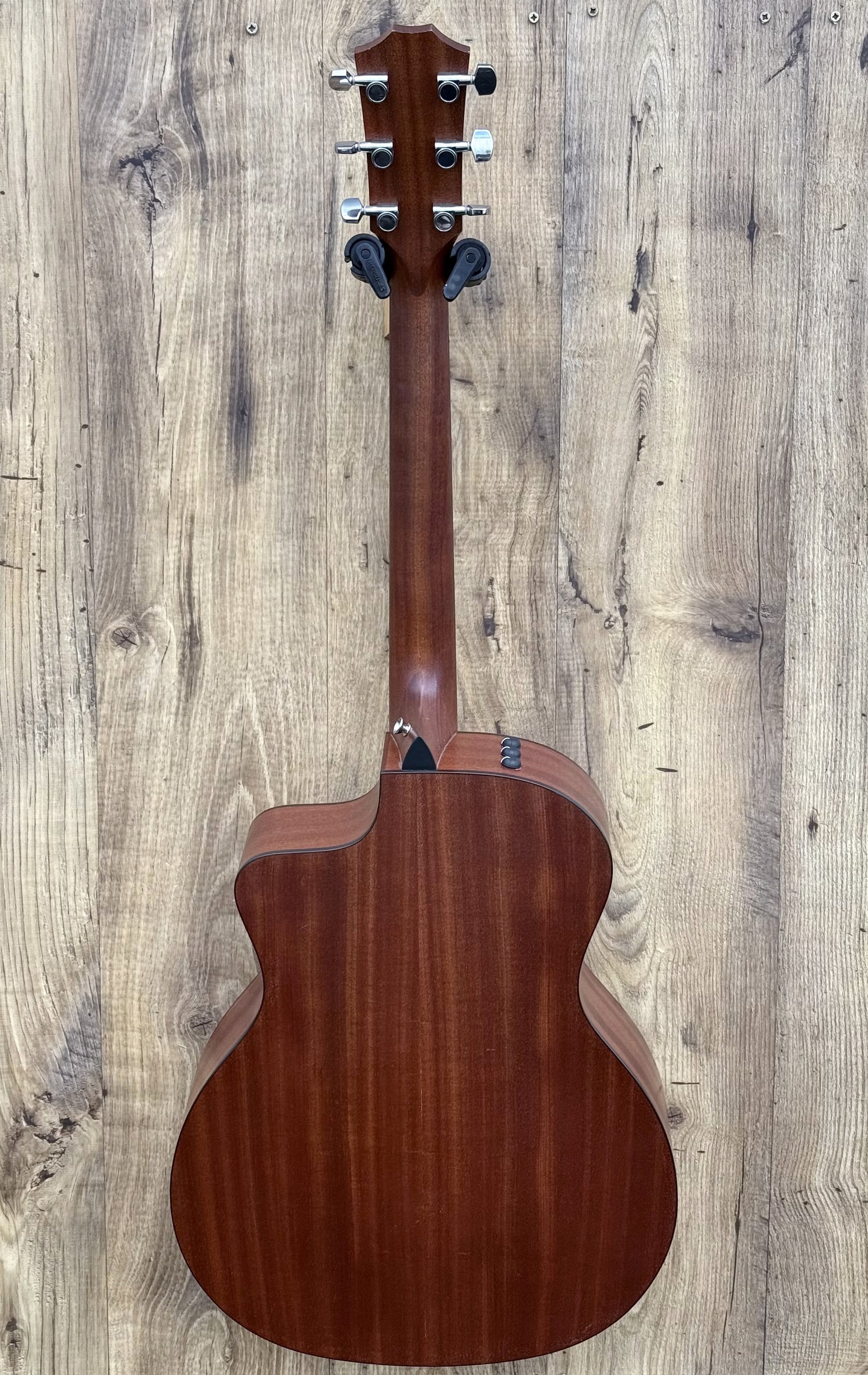 The 114ce’s Grand Auditorium body hits the sweet spot between dreadnought power and concert-style comfort. It’s big enough to project well but remains easy to handle whether sitting or standing. The solid Sitka spruce top provides the shimmer and dynamic range Taylor guitars are known for, while the layered sapele back and sides offer resilience without sacrificing tone.