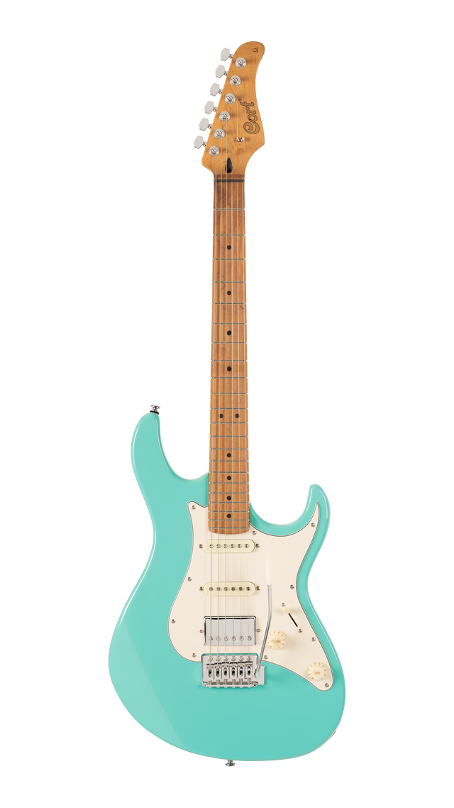 The Cort G200SE features a bolt-on poplar body paired with a roasted maple neck in a comfortable C-shape profile. Its 25.5" scale length and 22-fret roasted maple fingerboard with 9.5" radius provide responsive playability across a wide tonal range.