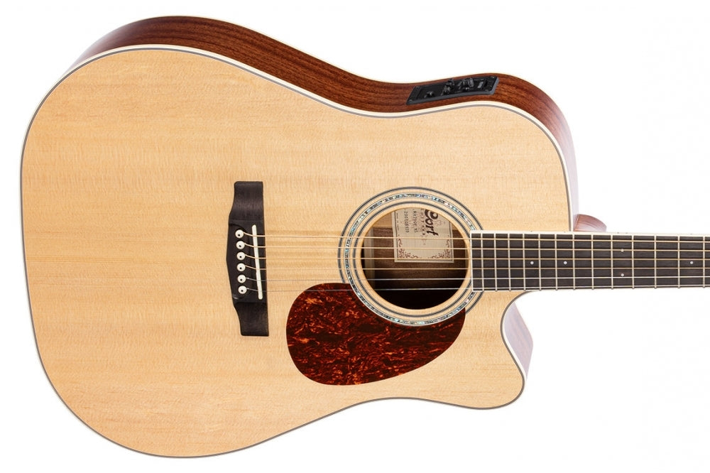 The exclusive scooped surface bridge from Cort enhances sustain with greater string angle from the saddle to the body while reducing tension on the strings acro