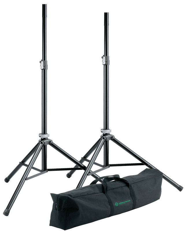 Two lightweight aluminium easy-to-carry speaker stands in a carrying case. Fiberglass-reinforced fittings and a compact clamp with a patented push-button system for height adjustment. The leg construction adjusts by an clamping lever.