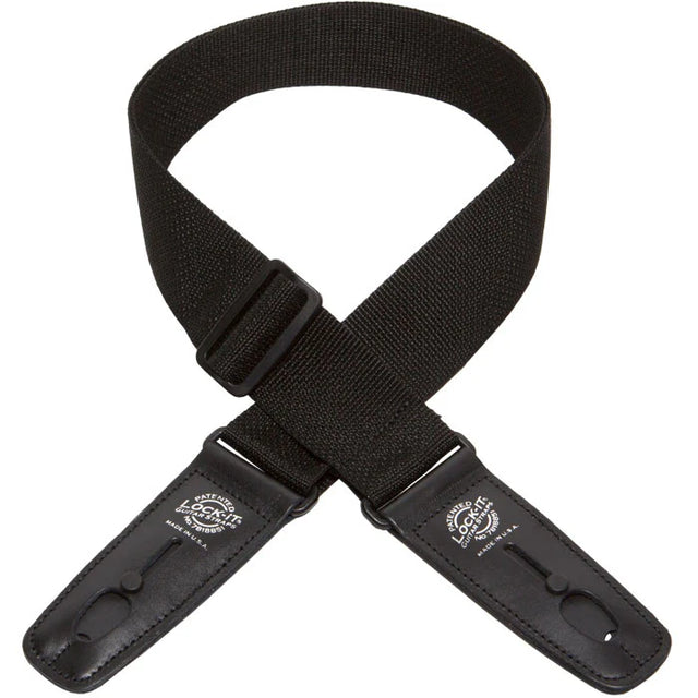 Lock-It Straps poly pro series. All straps are 2" wide polypropylene material and adorned with the patented and brilliant Lock-It strap locking system. No Guitar mods and a minimalist design sewn into a top class leather end. Straps extend to an extra long 62" in max length.