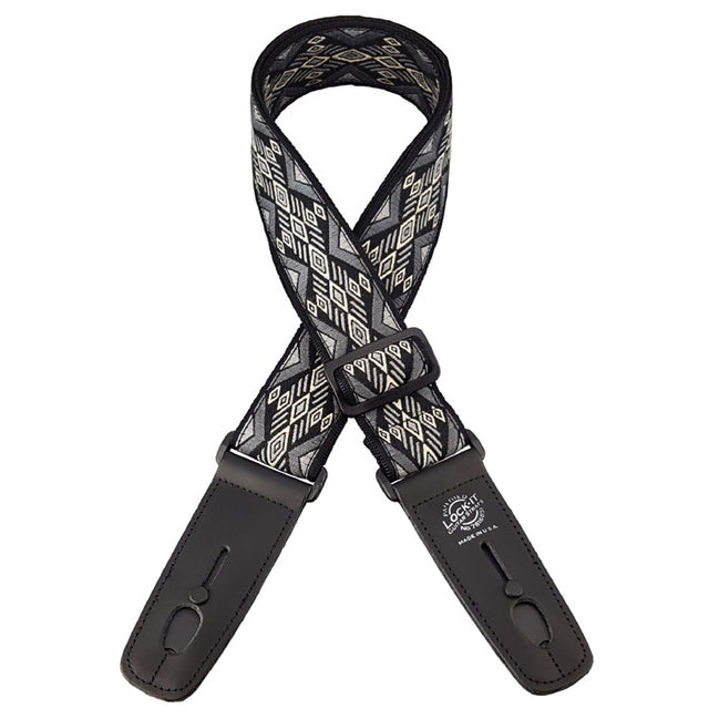 Lock-It Straps woven jacquard Retro series. All straps are 2" wide soft hand jacquard material with a smooth high quality nylon backing and adorned with the patented and brilliant Lock-It strap locking system. No Guitar mods and a minimalist design sewn into a top class leather end. Straps extend to an extra long 62" in max length.