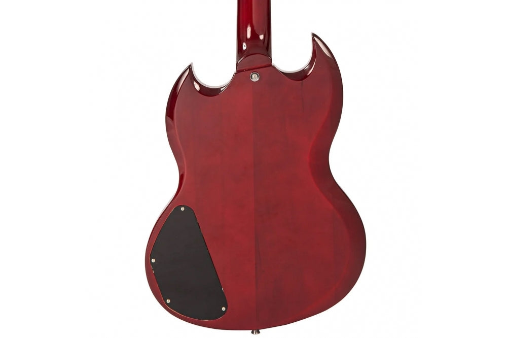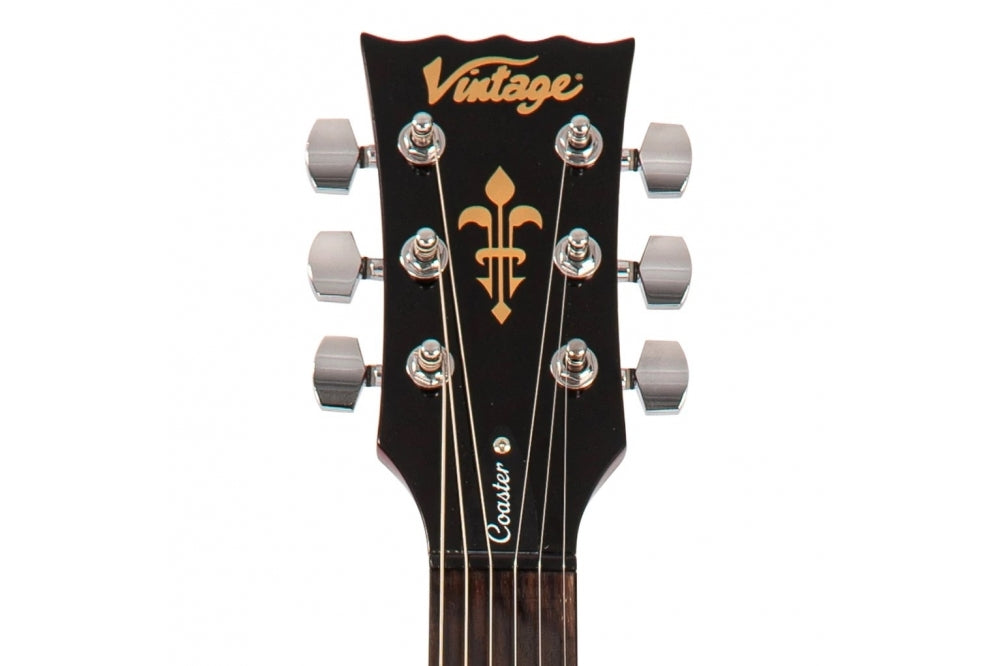 With a beautiful finish, offset with a 3-ply scratch plate, black control knobs and chrome hardware the Vintage Coaster V69 twin cutaway, solid bodied electric guitar is a fine example.
