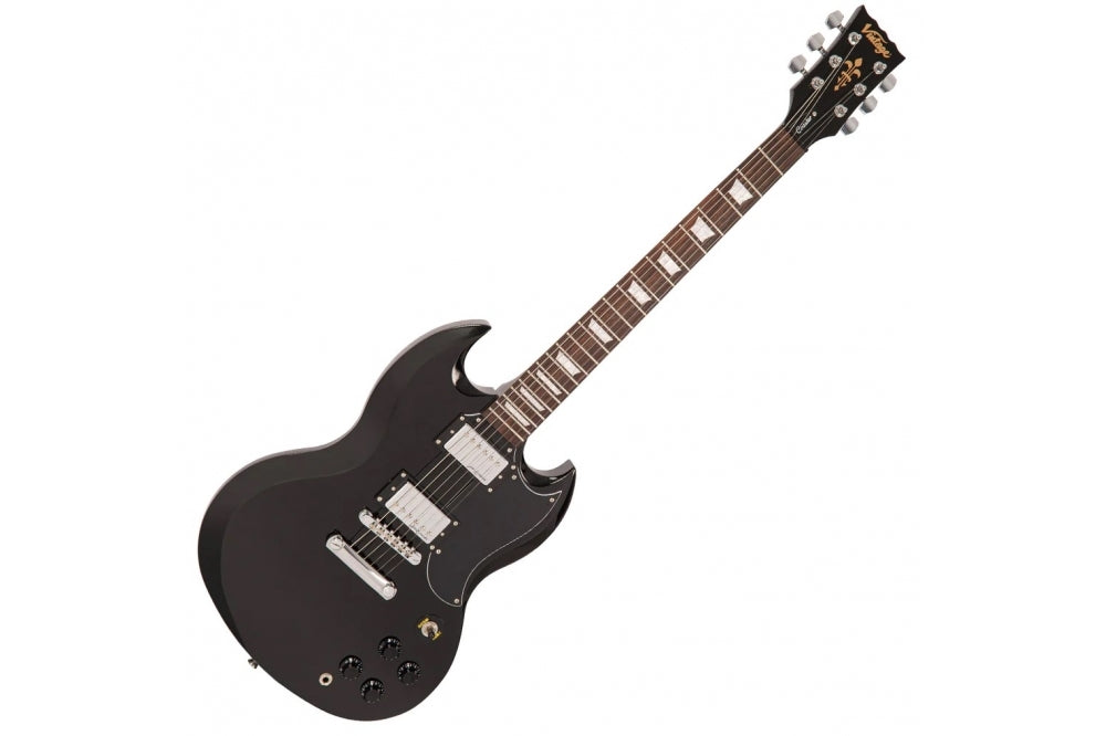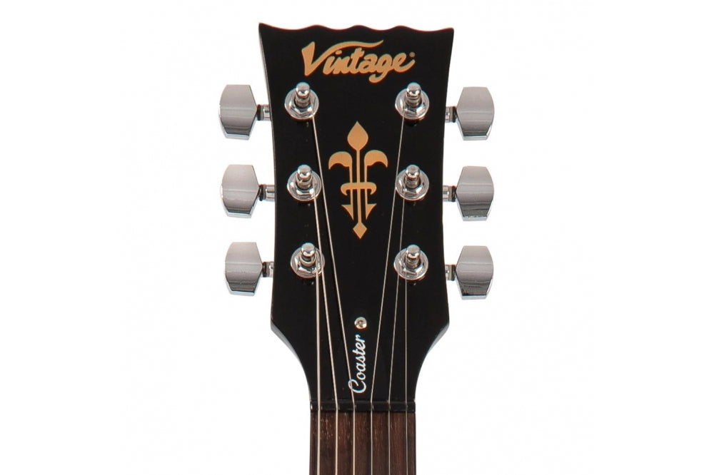 With a beautiful finish, offset with a 3-ply scratch plate, black control knobs and chrome hardware the Vintage Coaster V69 twin cutaway, solid bodied electric guitar is a fine example.